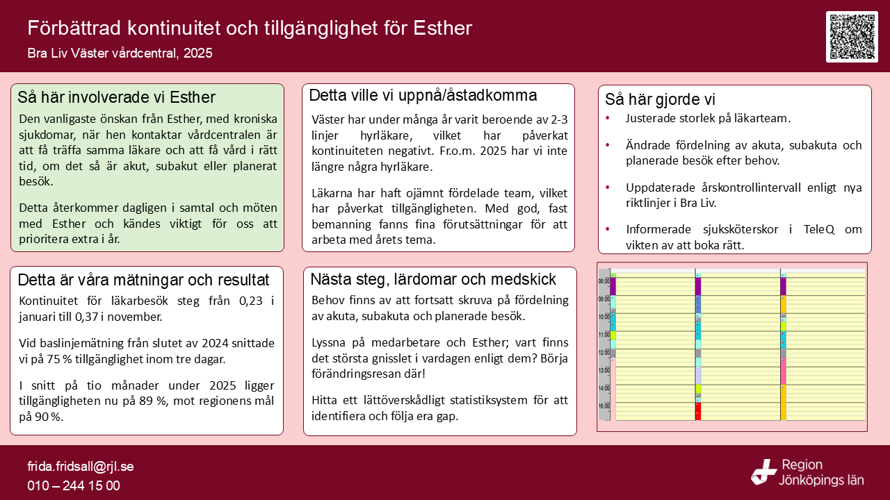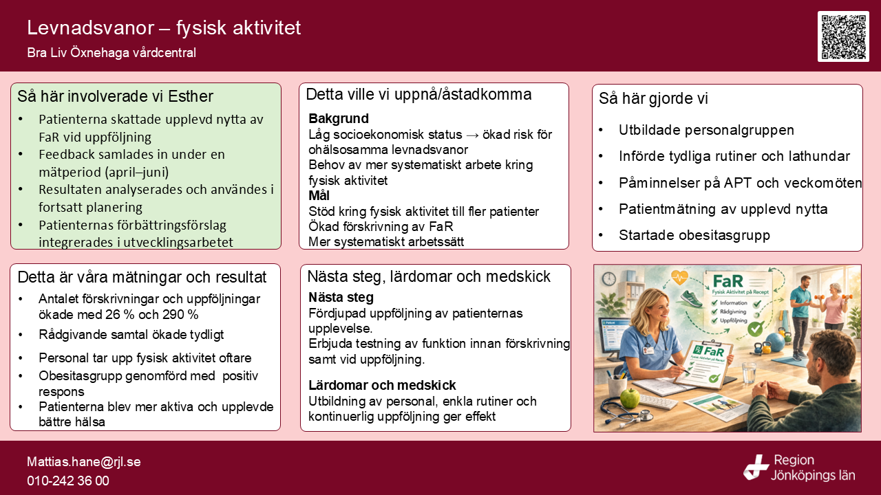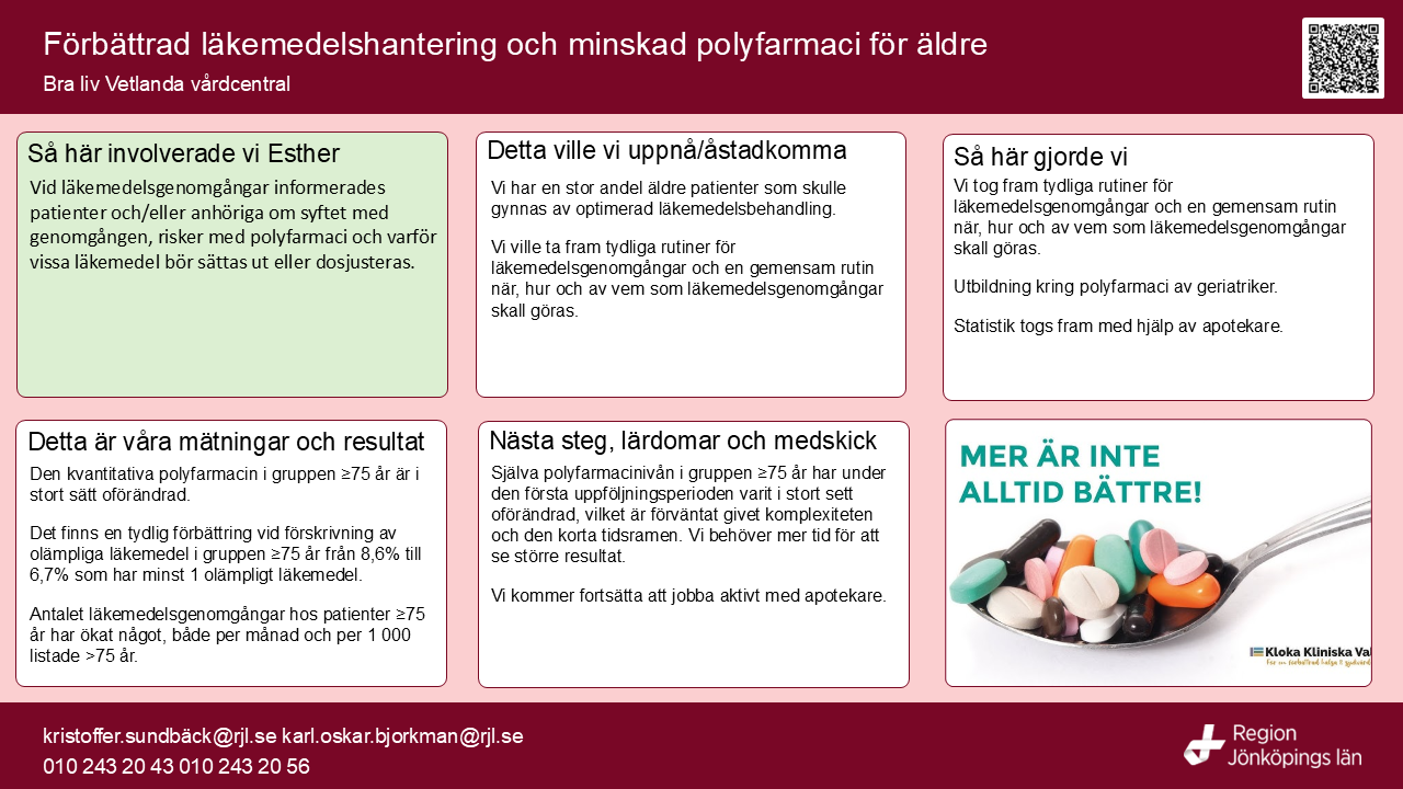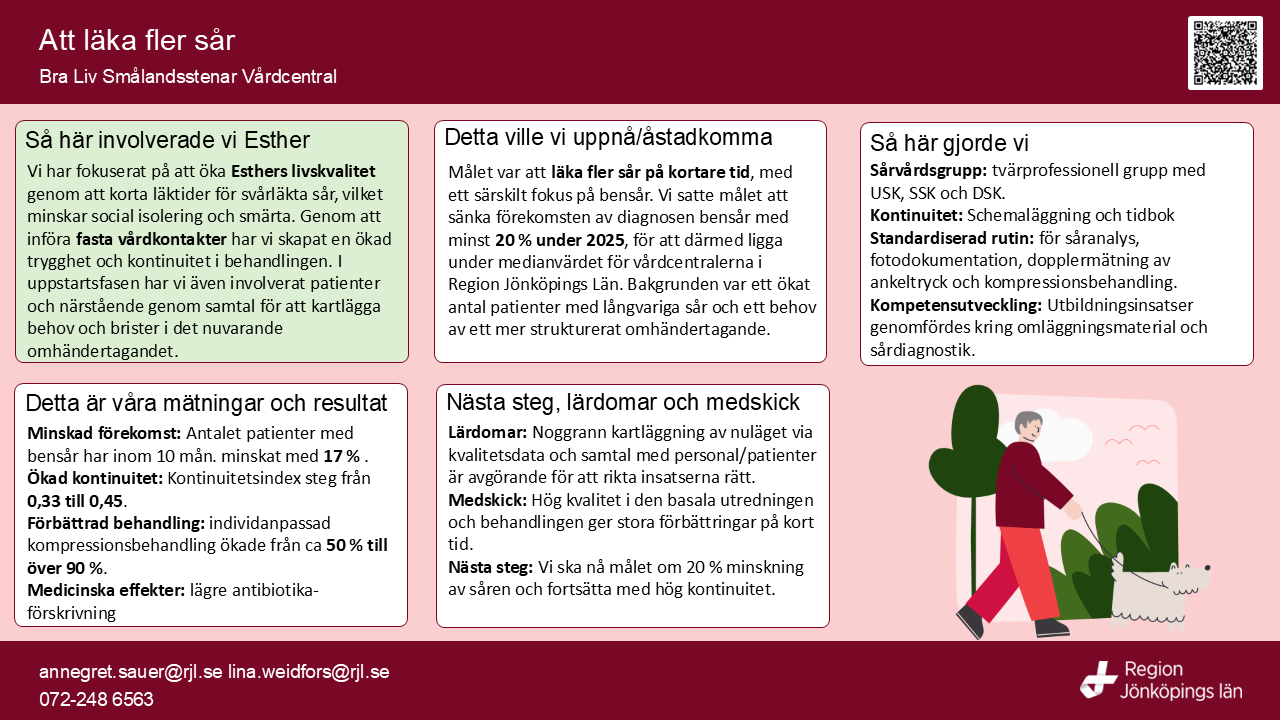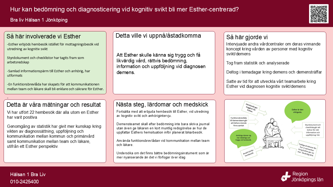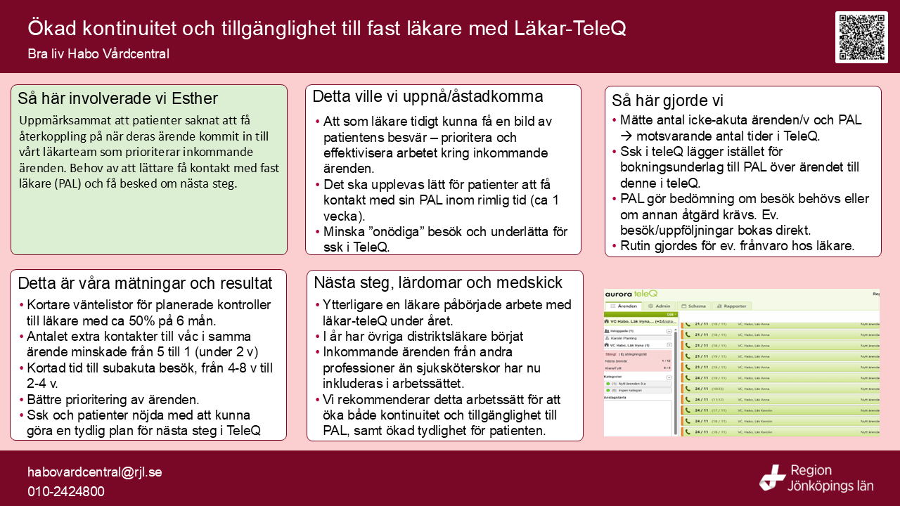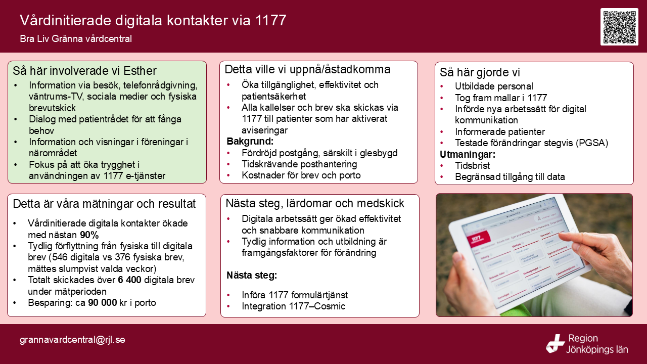 Här kan du ta del av årets förbättringsarbeten från alla vårdcentraler i Region Jönköpings län som ingår i vårdval. Arbetena presenteras här på konferenswebben med digital poster och det finns också möjlighet att läsa mer utförligt om arbetet i rapporten.