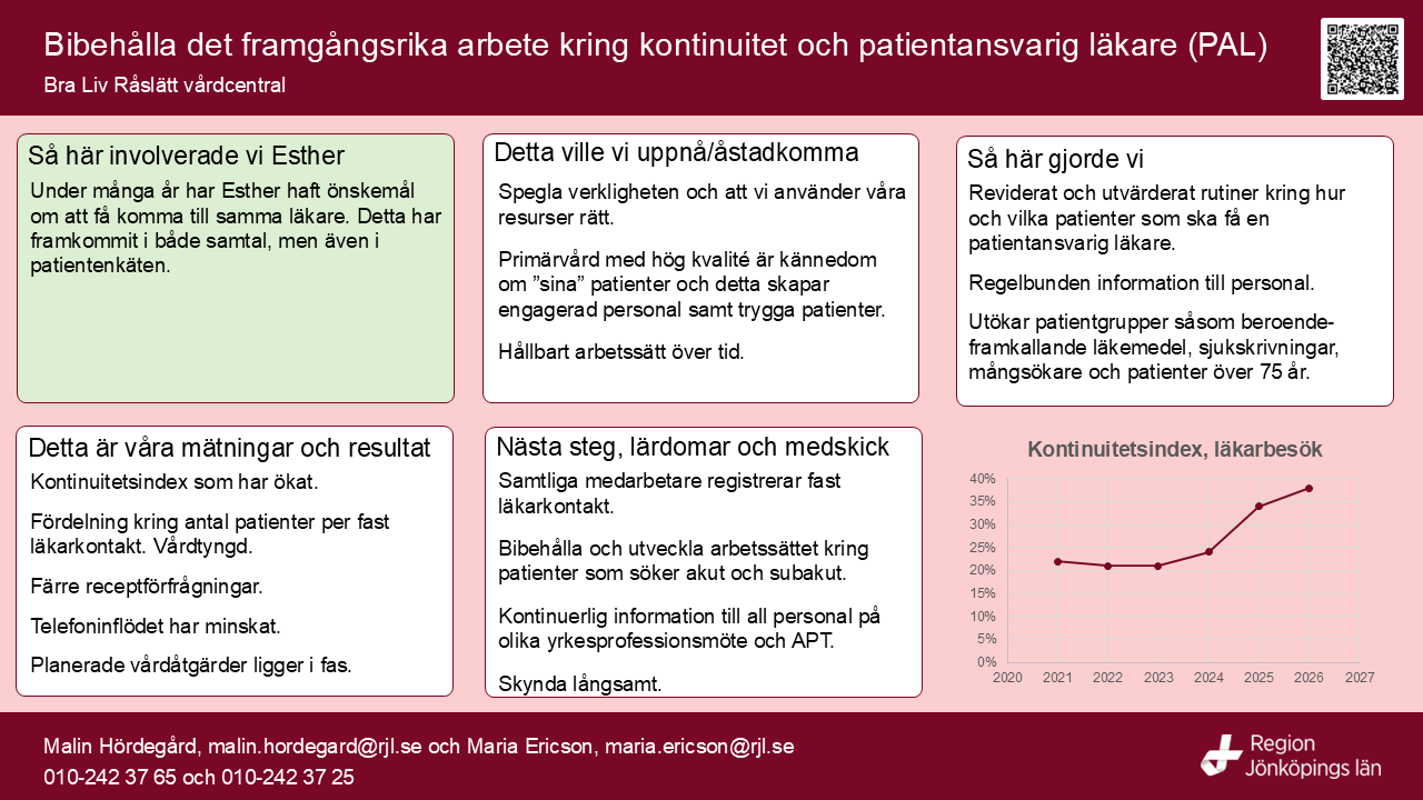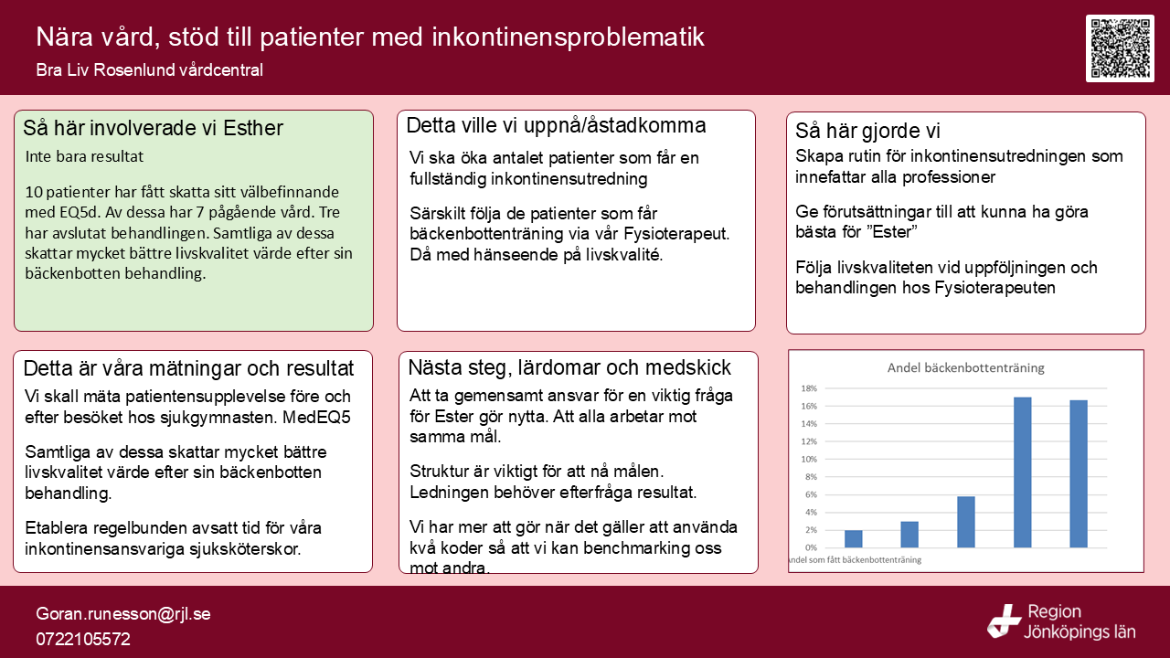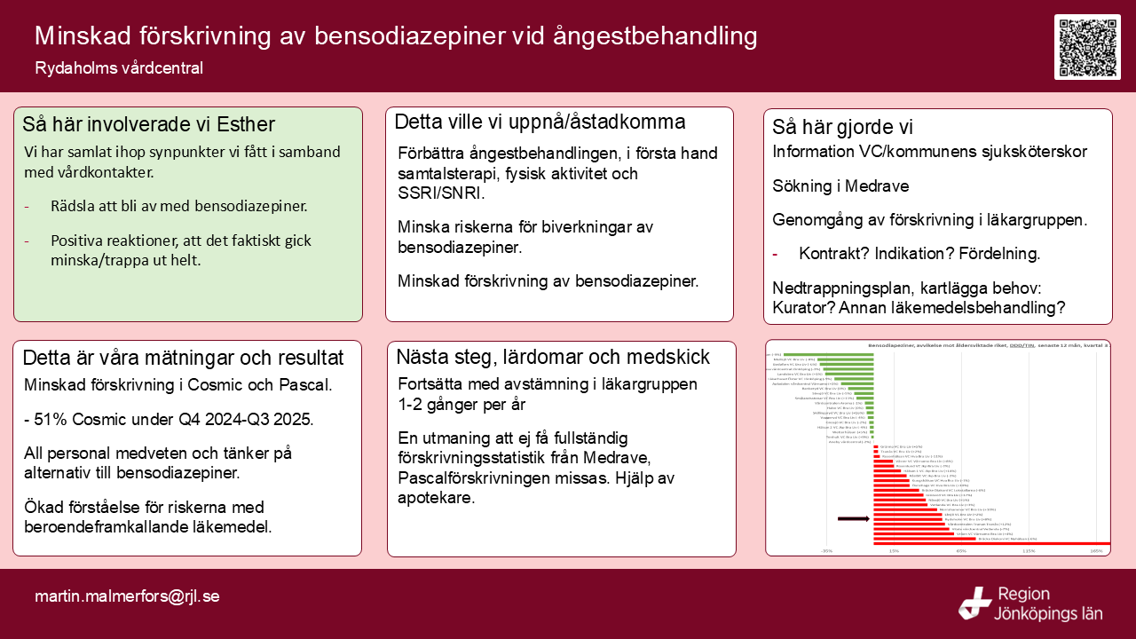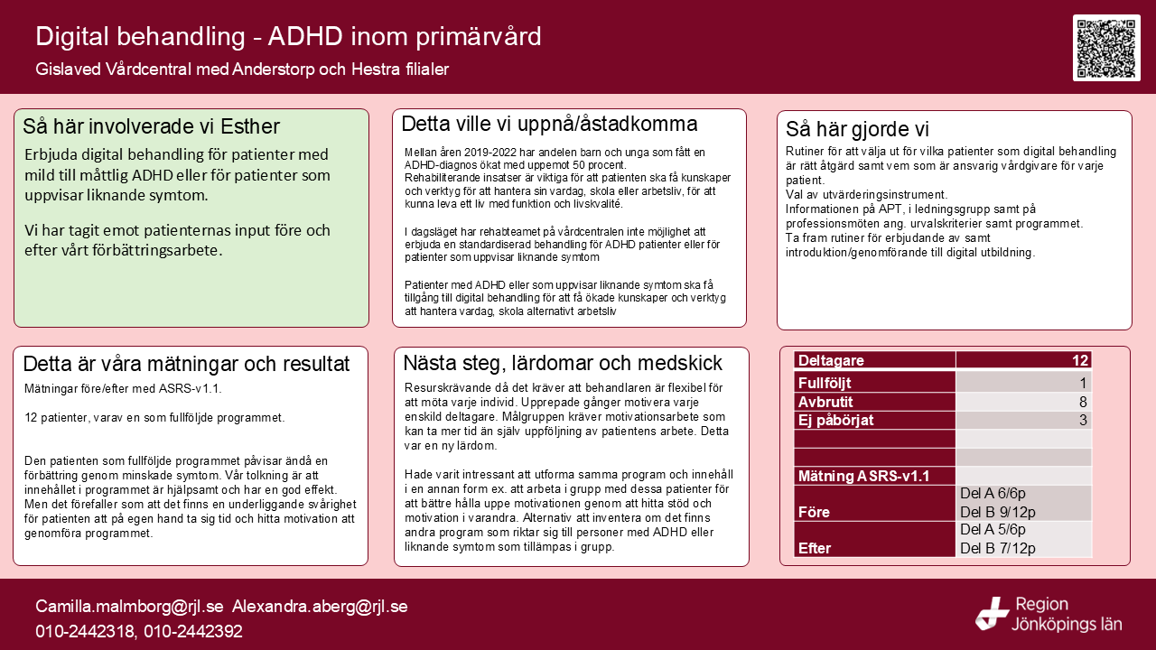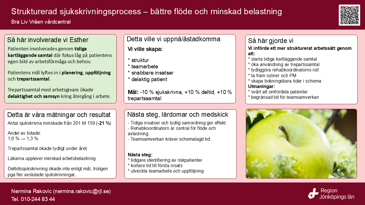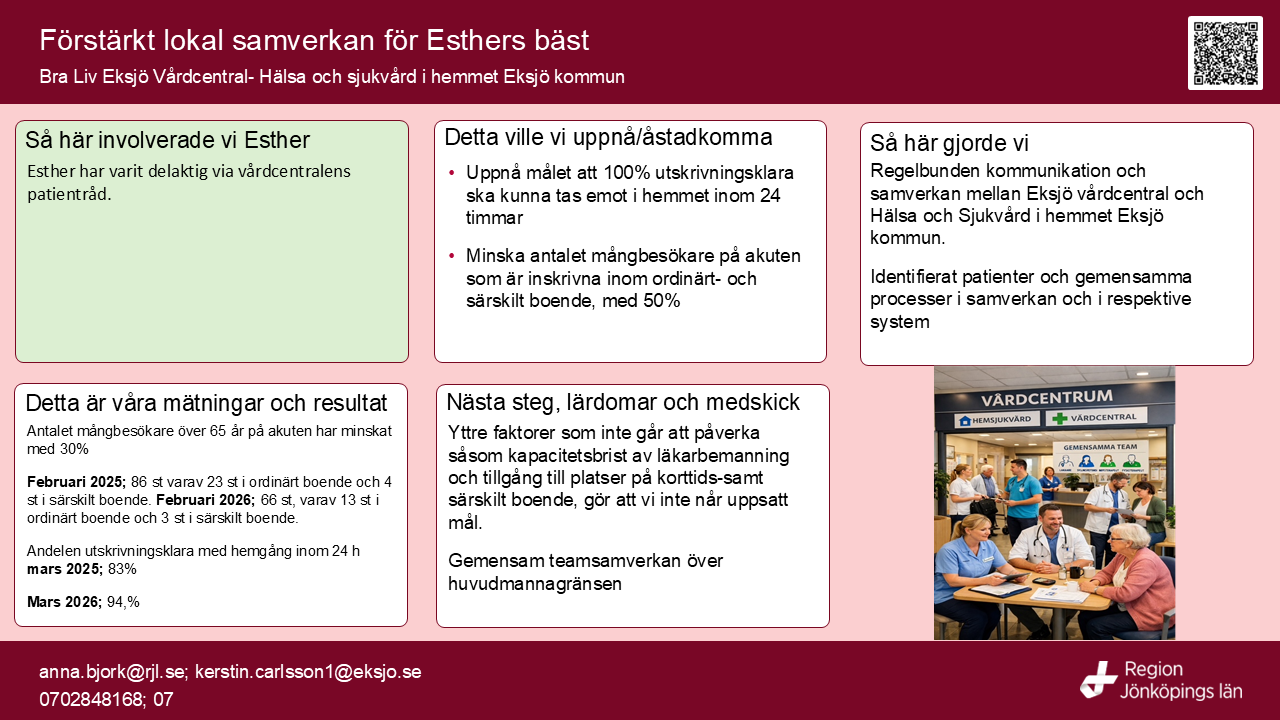 Här kan du ta del av årets förbättringsarbeten från alla vårdcentraler i Region Jönköpings län som ingår i vårdval. Arbetena presenteras här på konferenswebben med digital poster och det finns också möjlighet att läsa mer utförligt om arbetet i rapporten.