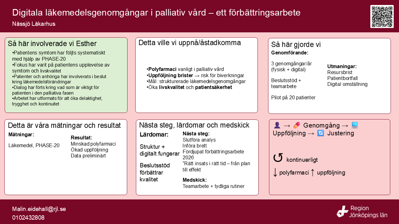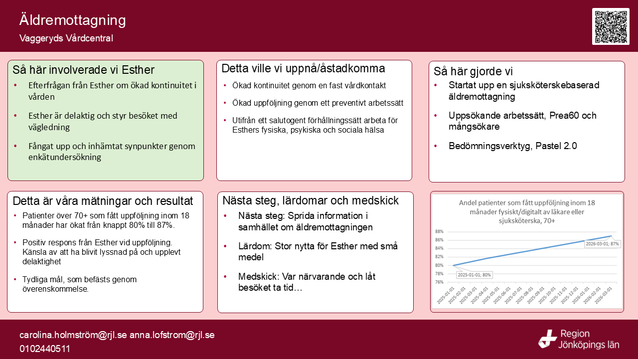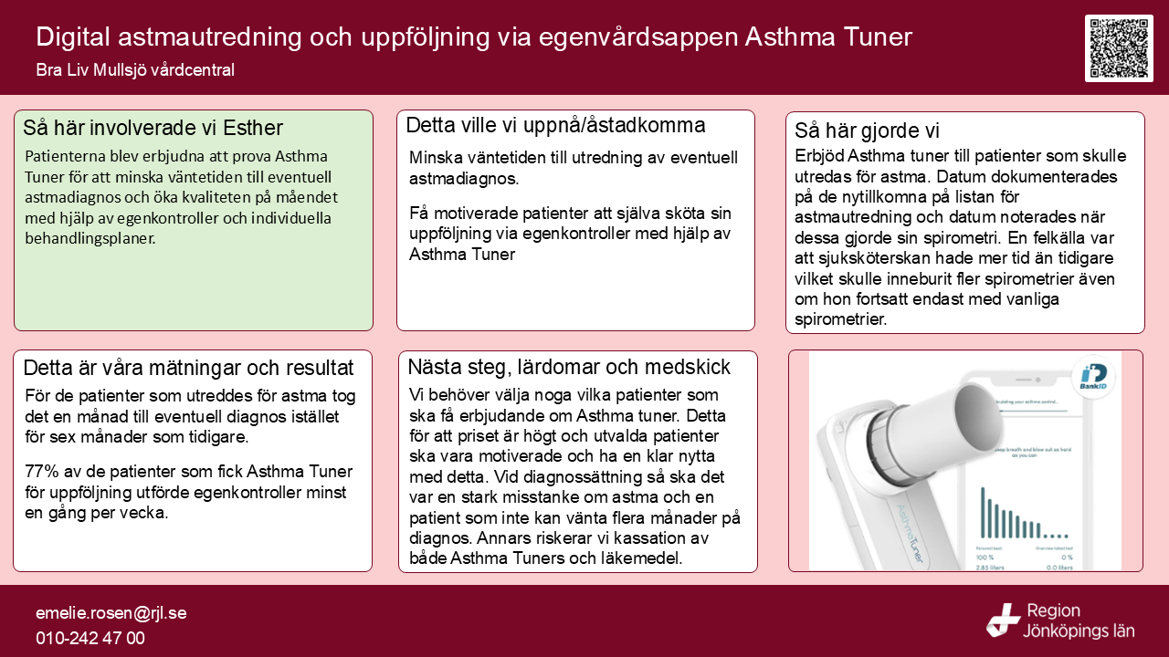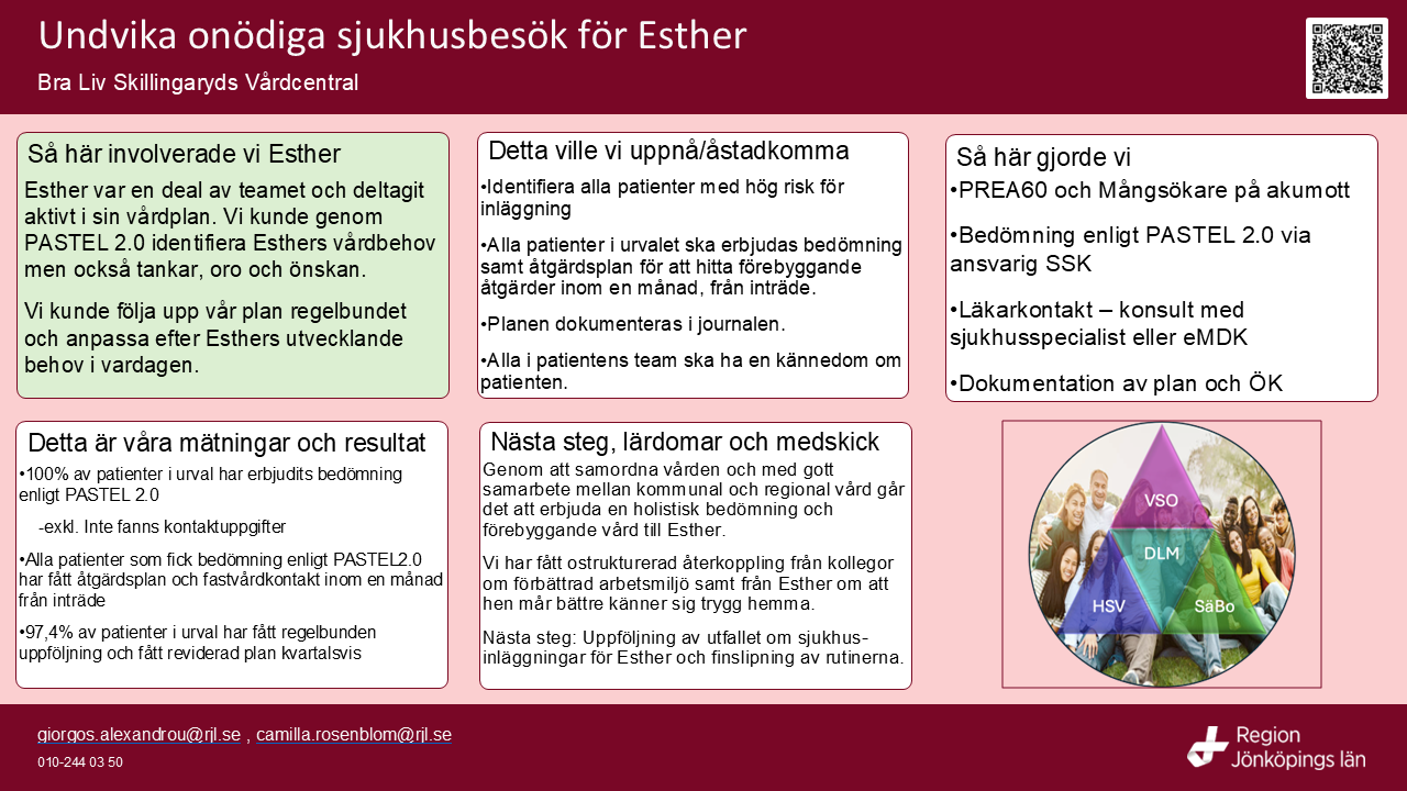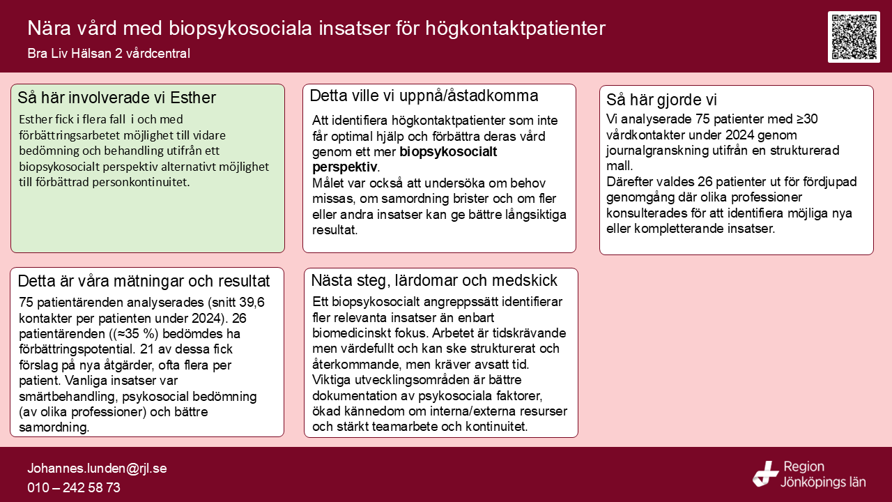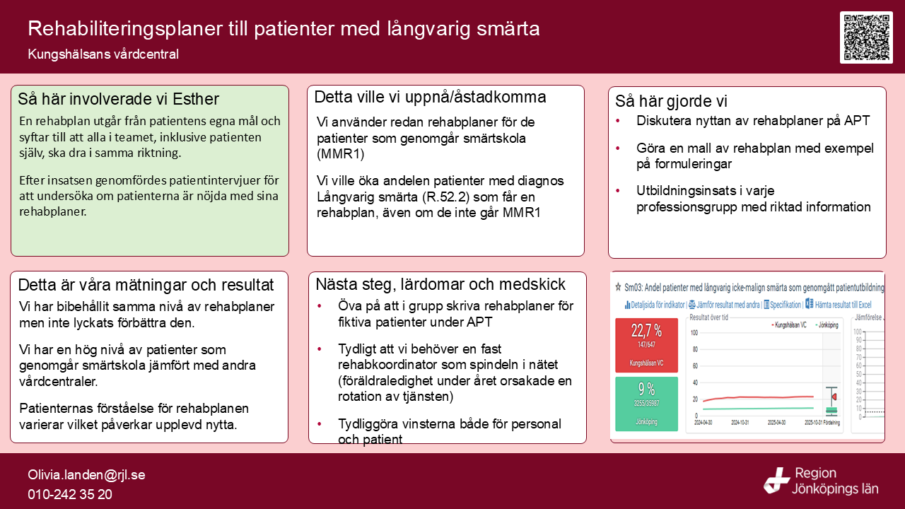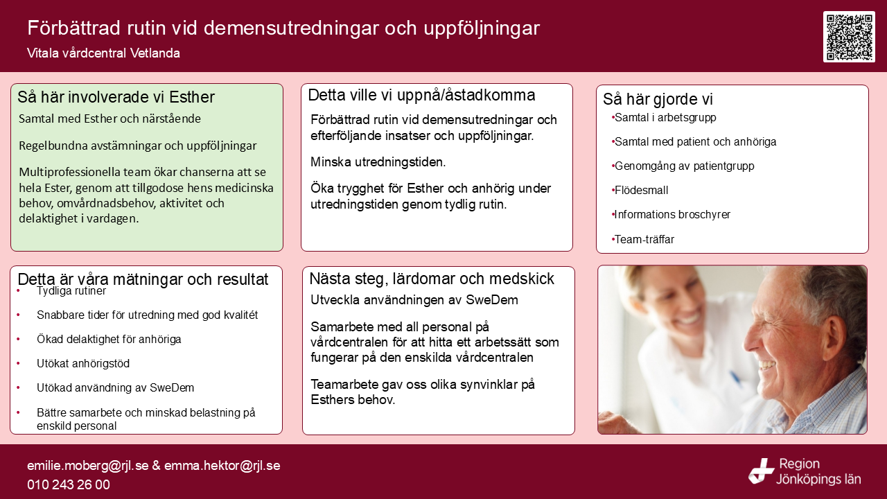 Här kan du ta del av årets förbättringsarbeten från alla vårdcentraler i Region Jönköpings län som ingår i vårdval. Arbetena presenteras här på konferenswebben med digital poster och det finns också möjlighet att läsa mer utförligt om arbetet i rapporten.