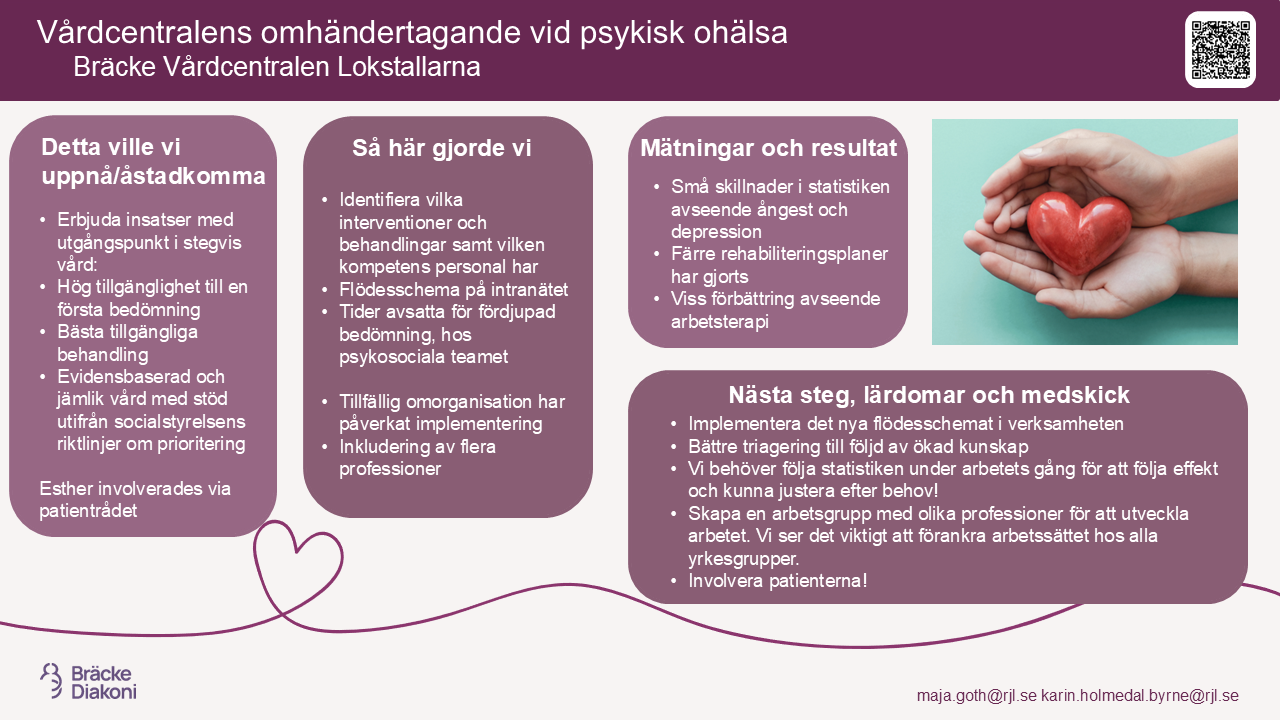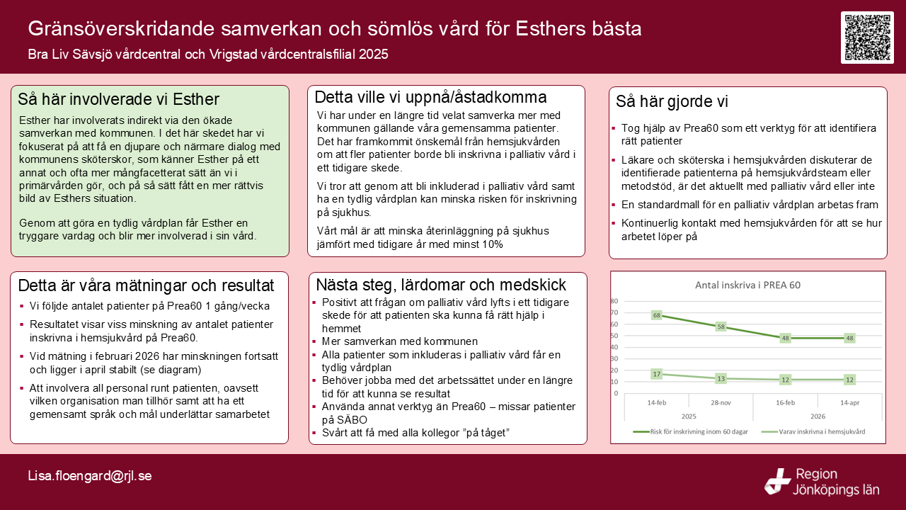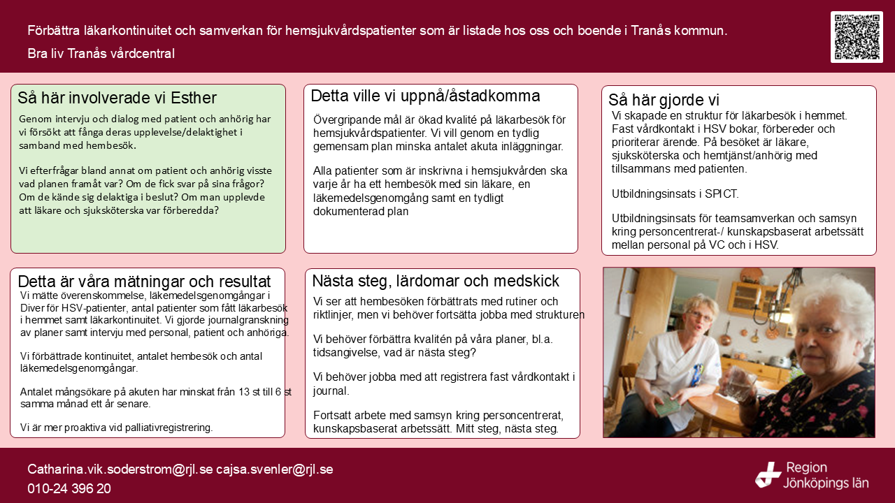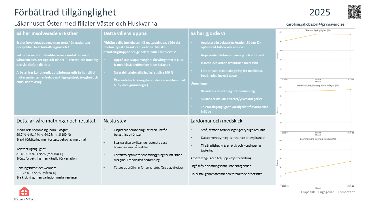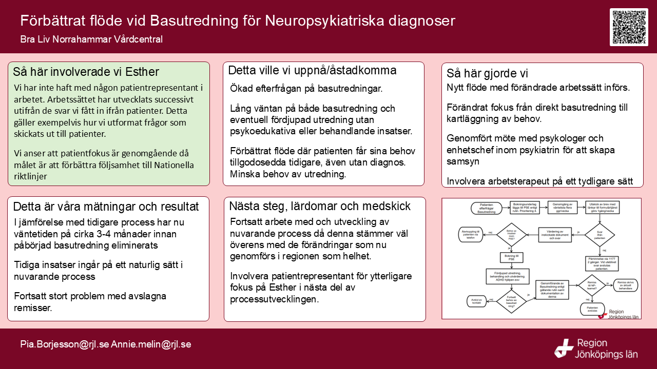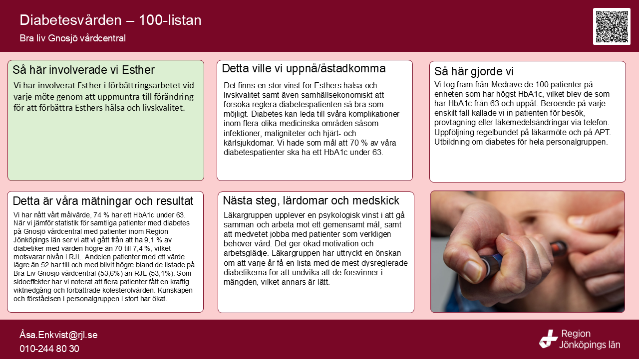 Här kan du ta del av årets förbättringsarbeten från alla vårdcentraler i Region Jönköpings län som ingår i vårdval. Arbetena presenteras här på konferenswebben med digital poster och det finns också möjlighet att läsa mer utförligt om arbetet i rapporten.