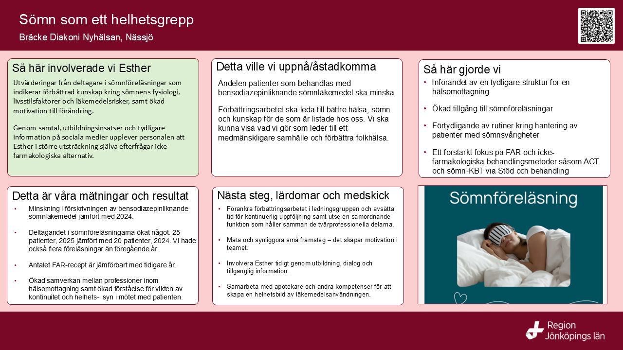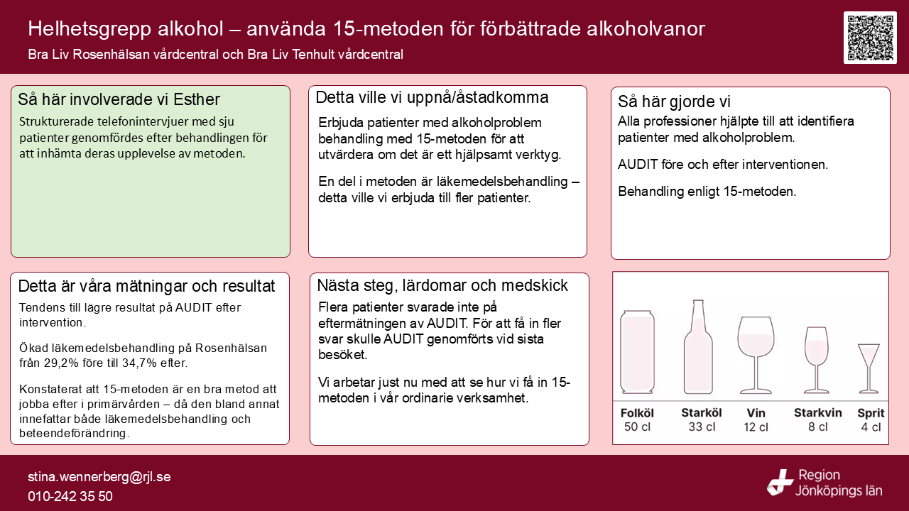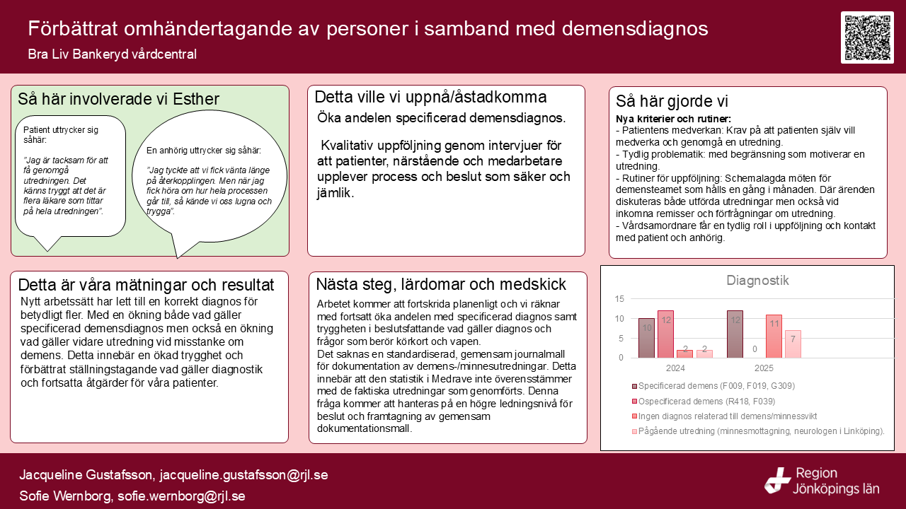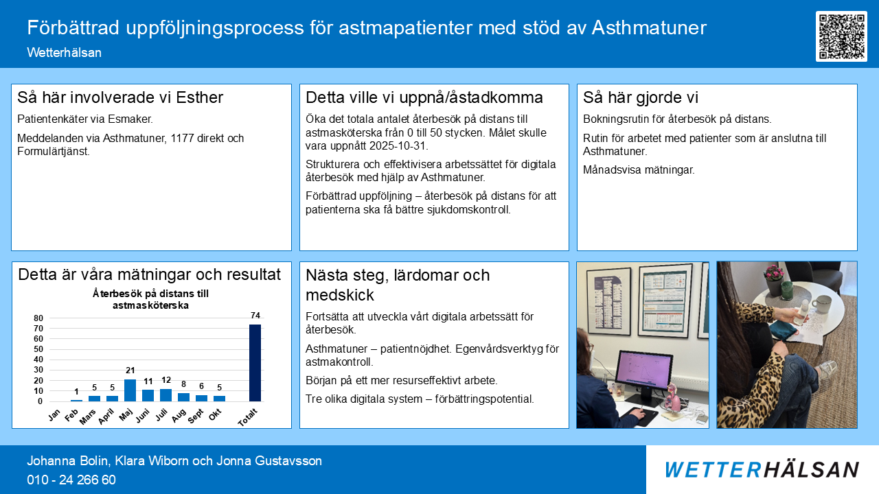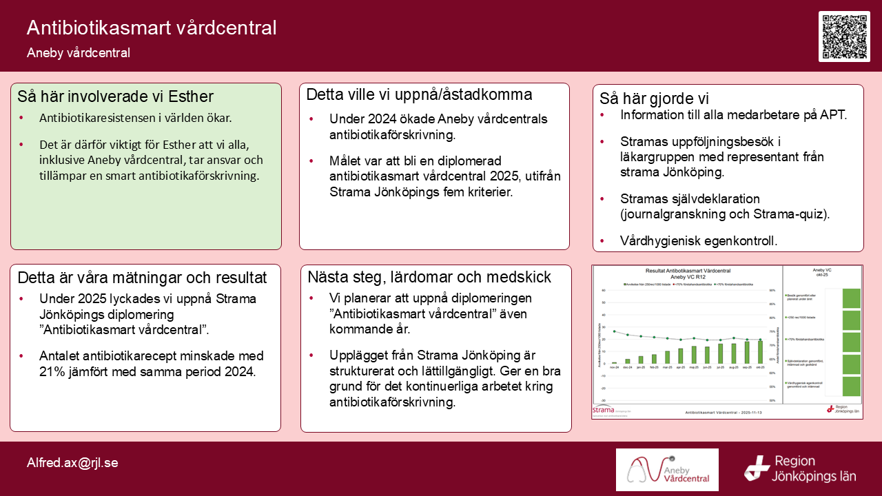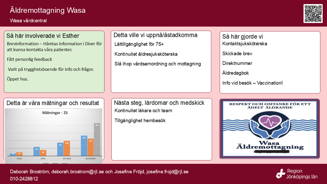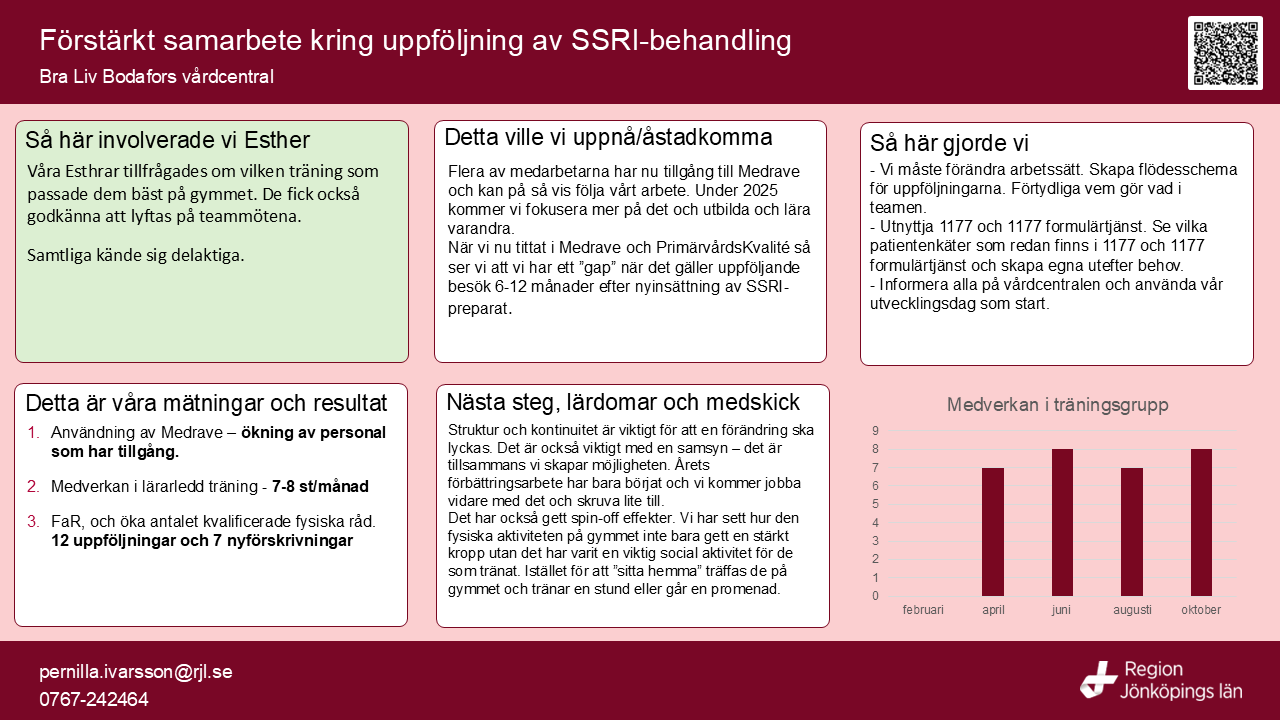Här kan du ta del av årets förbättringsarbeten från alla vårdcentraler i Region Jönköpings län som ingår i vårdval. Arbetena presenteras här på konferenswebben med digital poster och det finns också möjlighet att läsa mer utförligt om arbetet i rapporten.